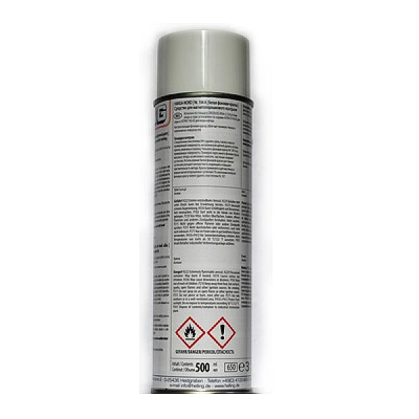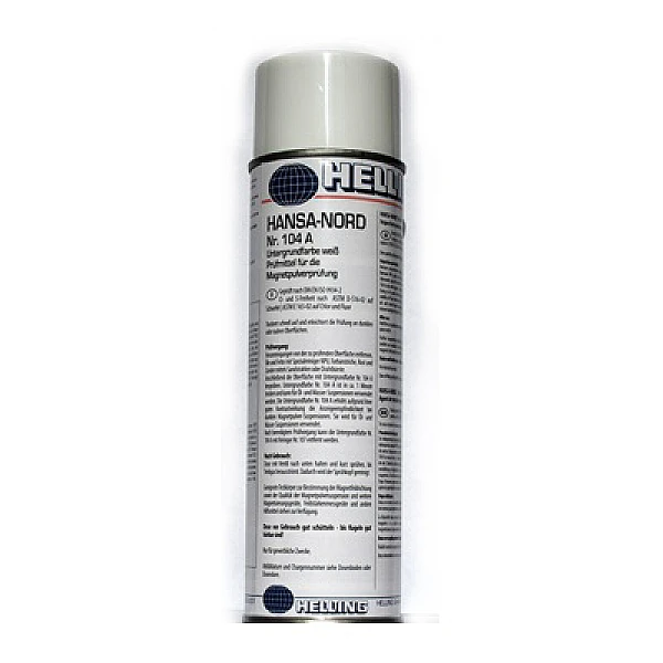 Белый контрастный грунт (фоновая краска) Helling HANSA-NORD NR 104 A - суспензия белого пигмента в слаболетучем растворителе, не содержит хлорированные углеводороды. Имеет короткое время высыхания (около 2 мин. при 20°C). Образует гладкий равномерный фоновый слой на проверяемой поверхности для дальнейшего нанесения цветных суспензий. Наноситься слоем до 30 мкм. Объем 500 мл.