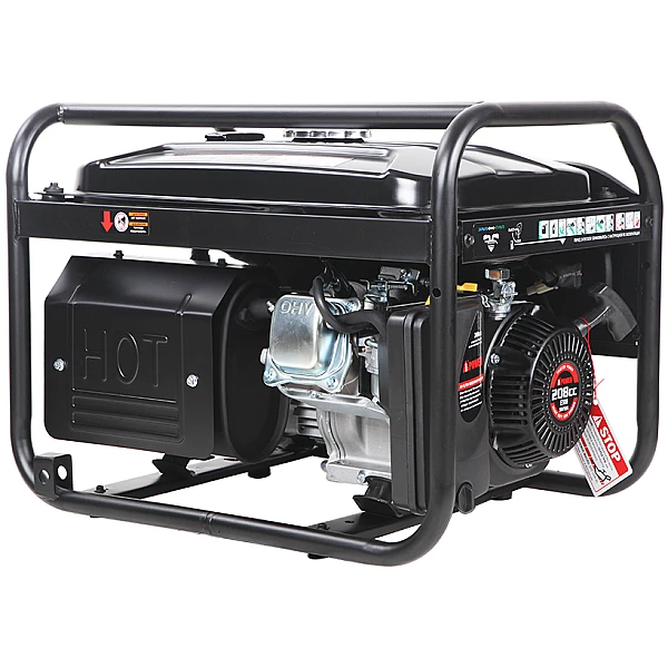 Бензиновый генератор основан на четырехтактном двигателе объемом около 200 см3 Небольшой, но достаточно мощный двигатель легко можно запустить ручным стартером.