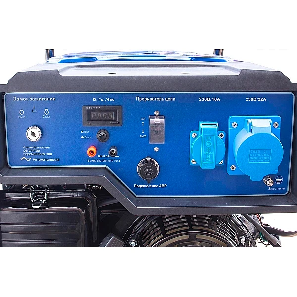 На передней панели расположены две розетки - однофазная, формата “евро”, и трехфазная, для оборудования, которому требуется полная мощность бензогенератора TSS SGG 7000E3A. Также предусмотрены клеммы 12 В DC для зарядки аккумуляторных батарей автомобилей и другой техники.