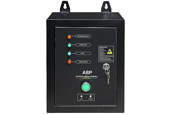 Блок АВР-С TSS 9000D/230/400 представляет собой выносное устройство управления, предназначенное для реализации функций автоматического ввода резерва. В случае перебоев в электроснабжении оно задействует цепи активации автономного источника энергии и переключает на него питание потребителей после выхода на рабочий режим. При восстановлении нормальной работы централизованной электросети автоматика выполняет обратное переключение нагрузок и останавливает резервный генератор TSS.