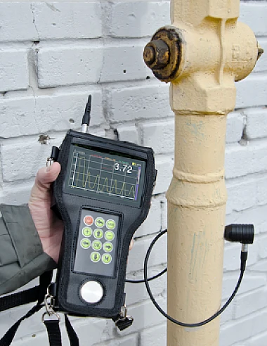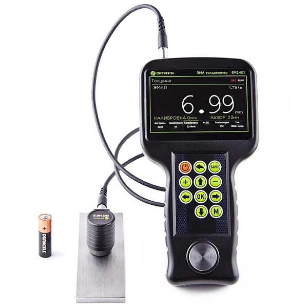 ЭМА — толщиномер EM1401 предназначен для проведения толщинометрии стальных труб, листового проката, прутов, и других изделий из стали, алюминия и других металлов с рабочим зазором между датчиком и металлом до 6 мм. Для работы толщиномера не требуется предварительная подготовка поверхности, не требуется наличие контактной жидкости. В качестве зазора может выступать грязь, слой ржавчины, слой солевых отложений или другое непроводящее покрытие (краска, лак, эмаль, пластик и т.д.).