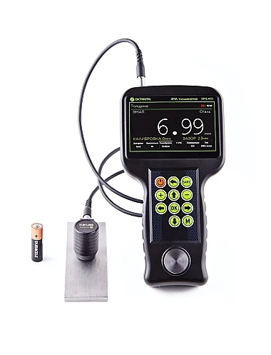 Толщиномер EM1401 имеет цветной дисплей, защищённый ударопрочным стеклом. Как и все ЭМА толщиномеры выпускаемые нашей компанией, толщиномер EM1401 использует специальный алгоритм обработки данных, который позволяет корректно измерять толщину в автоматическом режиме при наличии мешающих факторов, таких как анизотропия металла, наличие нескольких отражателей, наличие внешних помех. Помимо автоматического режима измерения толщины прибор позволяет использовать ручные режимы измерения по первому эхо-сигналу и по разности между любыми двумя эхо-сигналами. Ручной режим рекомендуется использовать на сильно корродированных объектах.