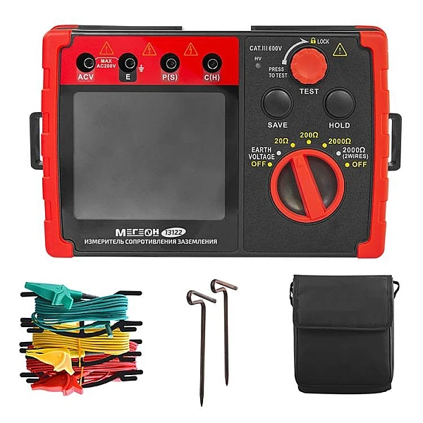 Цифровой прибор МЕГЕОН 13122 используется для определения сопротивления заземления по 2-проводной или 3-проводной схеме. Для дополнительной безопасности изделие оснащено измерителем напряжения земли (шаговое напряжение). Применяется специалистами для диагностики, технического обслуживания и ремонта различных заземляющих систем, электроустановок, распределительных устройств и УЗИП, а также другого электрического оборудования. Диапазоны измерений выбираются вручную. Предусмотрено удержание текущих показаний на дисплее. Модель имеет встроенное хранилище на 20 результатов.