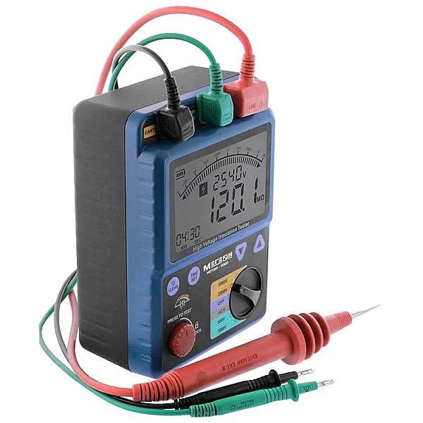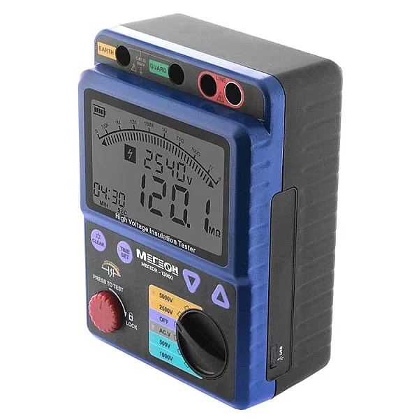 Портативный цифровой измеритель МЕГЕОН 13900 используется для определения сопротивления изоляции, а также для измерения постоянного/переменного напряжения и индекса поляризации (PI). Применяется профессиональными работниками для диагностики, техобслуживания и ремонта разных электрических двигателей, электроустановок, оборудования и выключателей. Устройство снабжено функцией автоматического переключения измерительных диапазонов (от 2 до 5). Присутствует звуковая и визуальная сигнализации подачи испытательного напряжения и авторазряда цепи после замера. Прибор имеет возможность автосохранения измеренных результатов на внутреннюю память.