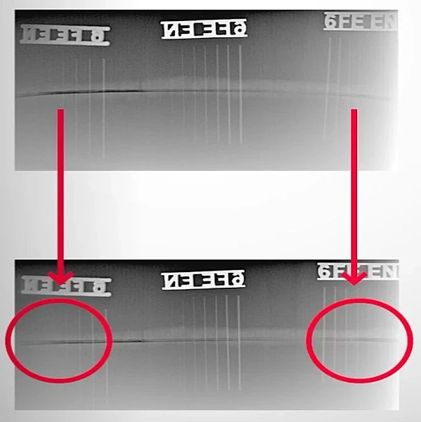При визуализации цилиндрических поверхностей с помощью жесткого детектора по краям снимка могут возникать искажения в виде дисторсии. Они обусловлены тем, что жесткий детектор не может прилегать вплотную к объекту по всей площади контроля. Одним из ключевых преимуществ использования гибких детекторов является увеличение активной зоны контроля и получение снимков с минимальной дисторсией.