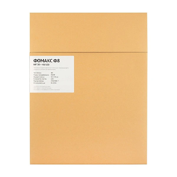 ФОМАКС Ф8 производится в формате листовой радиографической пленки (30 × 40 см), упаковывается по 100 листов в светонепроницаемый конверт. Существует два варианта упаковки: