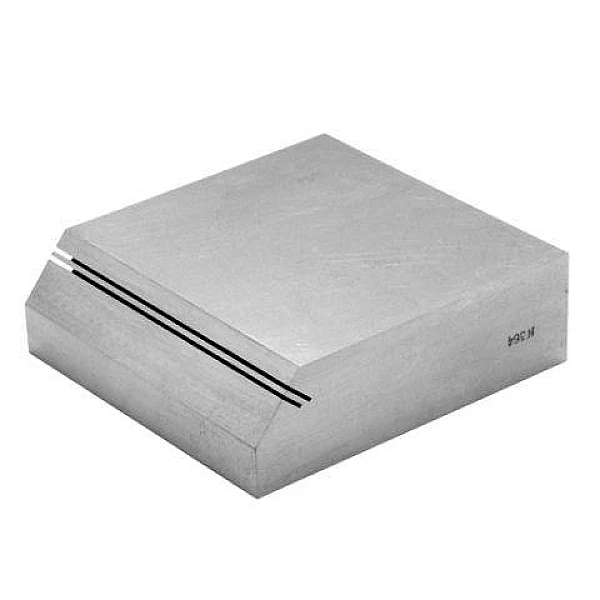 Стандартный образец СО-4 изготовлен в виде плиты со скошенной под углом 50° гранью, в которой выполнено два узких параллельных паза с изменяющейся глубиной в противоположных направлениях.